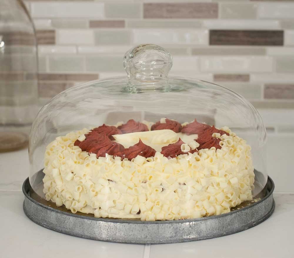 Here is a new dessert cloche with metal base, is round in shape and has a clear glass lid and a gray washed metal base, This measures 10'' dia. x 6''H. Includes a ¾'' tall base. Shown with an 8'' cake. That is not included, Only use with a plate or doily., Nice storage for smaller cakes or pies or cupcakes, bagels, etc And check out my other items i carry