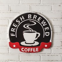 Here is a new retro design coffee wall sign. made of metal and has a nice black with red and white finish and reads Fresh Brewed Coffee, measures 16.5 inch wide by 15.25 inch high, Has keyhole hangers attached to hang, nice wall sign for a kitchen or restaurant, and check out my other decor and lighting i carry
